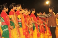 In 2012, we have embarked on a journey of transliterating the Borgeets into Bodo language, some of the Borgeets into Mising language. And we have trained people; we have employed teachers, who are dedicated souls. It is easy to talk about Samanvay, -(harmony efforts), in TV rooms. It is easy to write wonderfully about it but it is very difficult to practice. You have to walk the extra mile and it is very tough. Now through the Sanskritik Mission of Jengraimukh, Paschim Asom Sankskritik Mission, amongst the Rajbanshis and the Rabhas, among the Bodos of Tamulpur, the Non Bodos are learning to sing Bagorumba and other Boro cultural traits in Gohpur. The prayer Tumi Chitta that was presented before you today...the first stanza is sung in orginal as written by the Guru, the second stanza was sung in Bodo language. And the girls who have sung this are not Bodos they are Barua, Saikia, Goswami, Kalita, The third stanza was in Mising language and the fourth stanza was sung by Rajbongshis and the Rabhas of Sanskritik Mission and they sang the original language because that is the language very close to their own language.