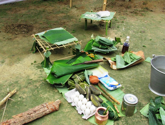 Kin-on-Meu or Na-Khuwa, which is a very popular and famous celebration among Tai Ahoms, is celebrated in the New Year’s month of Dinsing or Aghun month. In this festivals too, the first seasonal crop, vegetables and fruits produced by the household are offered to the dead first before praying to ancestors: ‘Oh, our Ancestors, we pray homage to you on this day. Please bless us. If there is any misfortune likely to occur to any member of our family, we pray for its remedy and wellbeing of them. Because today is the occasion of Na-Diya (first use of the rice from the harvest), the offerings are made to the deceased. May the deceased be satisfied at this offering and do away with any kind of disease, misfortune or evils that might occur; and may they bless the household with such abundance that granaries in the front and backyard remain full throughout the ages to come and the beggars and paupers may also be given enough of the grains from them.’