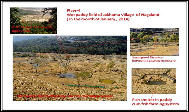 Similar principles are also adopted in the Karbi village of Rongchek under the Chingthong development block of Karbi Anglong where only because of the watershed principle base, their traditional Longsor irrigation system is alive (plate-3). Here, the community maintains a sacred forest on top of the hill, the agro-forestry system in the intermediate height, and wet paddy cultivation in the valley part. This land use categorisation helps in harnessing water. Similar practices are seen in the agricultural fields (wet paddy terraces) of Angami Nagas in the Jakhama village of Nagaland (plate-4). It is noteworthy that Angami Nagas are one of the prominent Naga groups who practice wet terrace cultivation traditionally. In Jakhama, the surrounding forest cover around the wet paddy fields maintains the watershed regime critically. This is also seen in the practices of the Apatanis of Arunachal Pradesh. The surrounding forest and bamboo groves help the Apatanis to protect their soil and supply water with nutrients to the paddy fields where the paddy-cum-fish farming practice isprevalent. Such practices are most pulsating in the Hiza village of Zero in Arunachal Pradesh (plate-5).