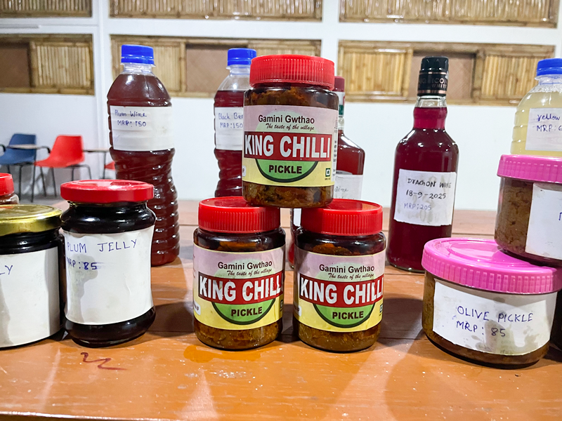 Alongside mushroom farming, Krishna has also diversified her livelihood by making pickles and fruit-based products using locally available ingredients. She prepares pickles from mango, king chilli, olive, and pork, and makes plum jelly and juices from fruits such as dragon fruit, plum, blackberry, gooseberry, and mombin. However, these ventures too come with challenges. During the rainy season, drying ingredients becomes difficult, and proper airtight containers are costly and hard to find in the village. “Sometimes the pickles spoil before I can sell them all,” she says.