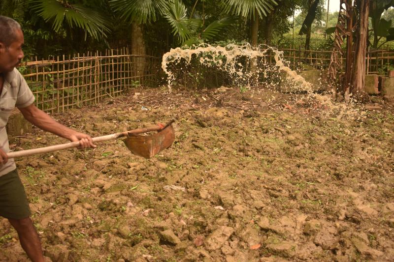 The process begins with the scouring of a source of clean water to channel into the seed-sowing ground. This channel is often sourced through rain-water harvesting fresh water ponds or in a more modern scenario - using a motorised pump. In this scene however, the source was a cut-out canal alongside the harvesting ground. Thus, the process of seed-sowing, known as “Kothia Pora” begins.