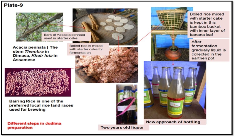 The bark of the tree is used as a substrate for preparing the rice starter cakes (Humao) which is then mixed with fermented cooked rice. Usually, the boiled glutinous variety of rice is mixed with the Humao and kept for 5-7 days to ferment. (plate-9). A study on the physiochemical parameters of the bark of the Acacia Pennata tree reveals that it has 15 per cent alcohol soluble extractive, 10 per cent methanol soluble extractive and pH value of 7.33 (As per the Journal of Pharmacognosy and Phytochemistry, Vol. 2 No. 2 2013,pp.134-140). The bark also gives octacosanol, beta-amyrin, uvaol, beta-stosterol and its glucoside and erthrodiol. As per another study, the fermentation of the rice mixed with plants leaves/barks contain an array of phyto-chemicals, broadly described as phytoestrogens, terpenoids, carotenoids, limonoids, phytosterols, glucosinolates, polyphenols, flavonoids, isoflavonoids and anthocyanidins. These may provide health benefits including prevention and/or treatment of diseases and physiological disorders (International Food Research Journal 21(2), 2014: pp. 463-470). These phytochemicals, either alone and/or in combination, have tremendous therapeutic potential for various ailments (As per Journal of Chinese Medicine Research and Development 1, 2012: 70-78).