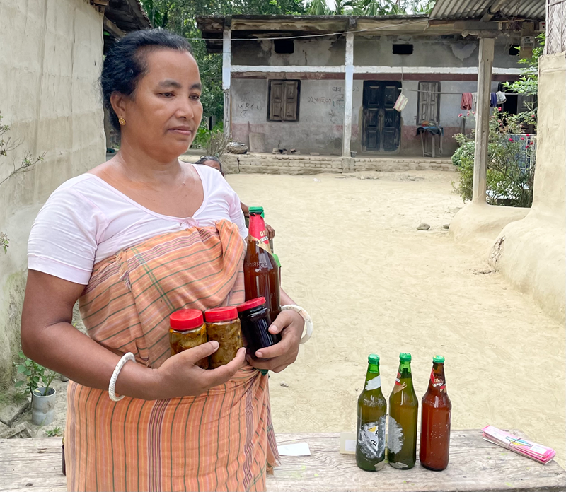 She now sells mushrooms in nearby Rupahi and Mainao Bazaar, where demand remains steady. Whenever tourists or guests visit the Aaranyak office near the national park, she brings her mushrooms and homemade juices to sell there as well. During local events like the Manas Festival, she sets up a stall to sell her mushrooms, pickles, and fruit juices, which attract both local residents and visitors. Over time, her products have gained such popularity that many customers now come directly to her home to buy mushrooms, pickles, and juices, knowing they are fresh and homemade.