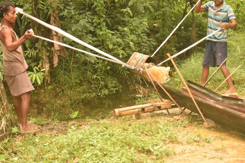 Then comes the use of a special instrument called Duhoti. This instrument is used to carry up the water from its source, to the channel, and finally into the sowing ground. The purpose of water sourcing is to dampen the ground, to prepare it for sowing. However, the use of a motorised pump skips the use of a Duhoti.