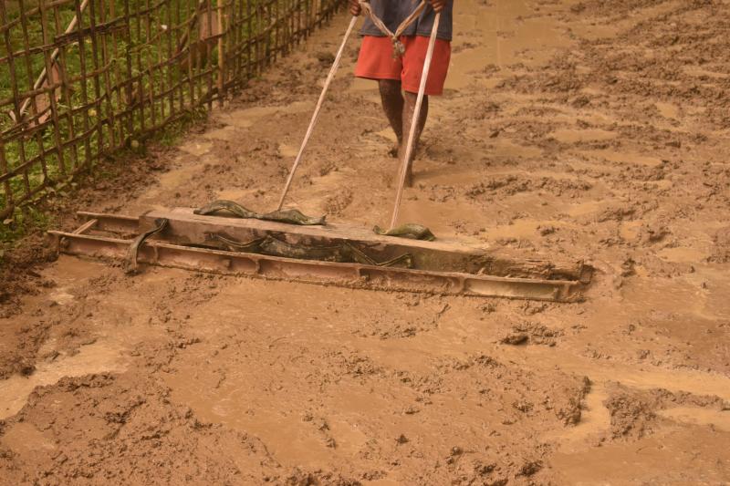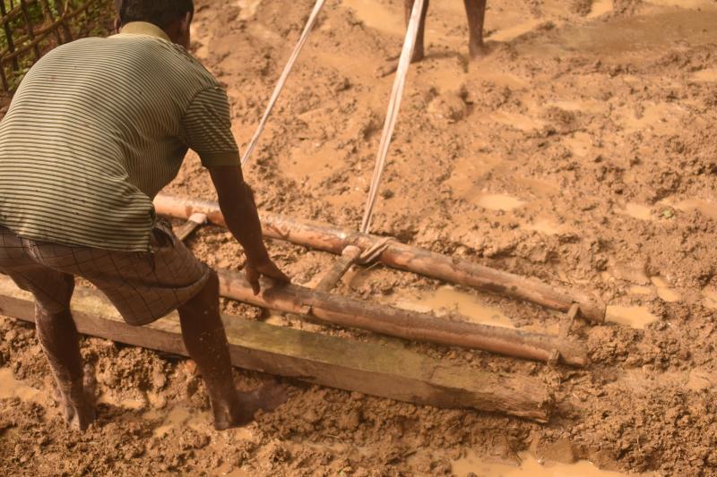 The process begins with the scouring of a source of clean water to channel into the seed-sowing ground. This channel is often sourced through rain-water harvesting fresh water ponds or in a more modern scenario - using a motorised pump. In this scene however, the source was a cut-out canal alongside the harvesting ground. Thus, the process of seed-sowing, known as “Kothia Pora” begins.
